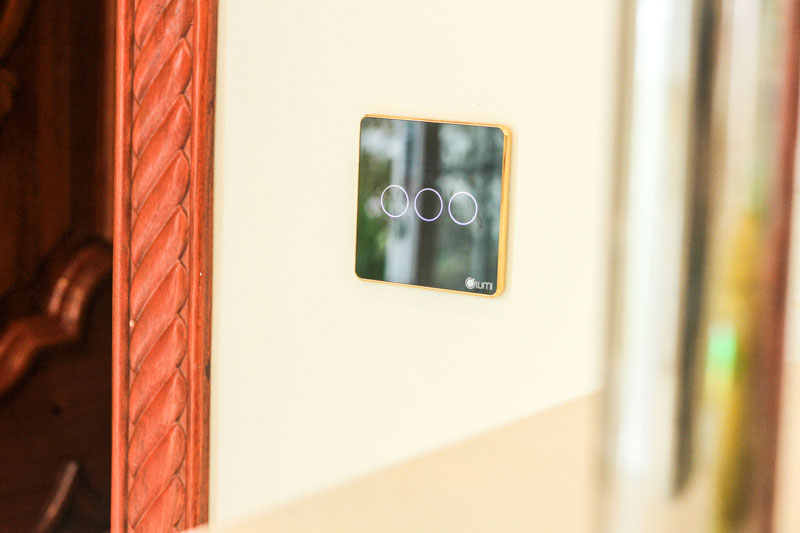 Công tắc Lumi viền vàng, hoàn toàn khớp với tông màu của căn nhà
